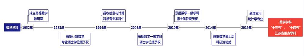 数学学科,1983年获批计算数学硕士点,是国内第二批拥有计算数学硕士学位授予权单位,2005年获批数学一级学科硕士点,2010年获批数学一级学科博士点,2014年获批数学博士后科研流动站,数学学科入选“十三五”和“十四五”江苏省重点学科。