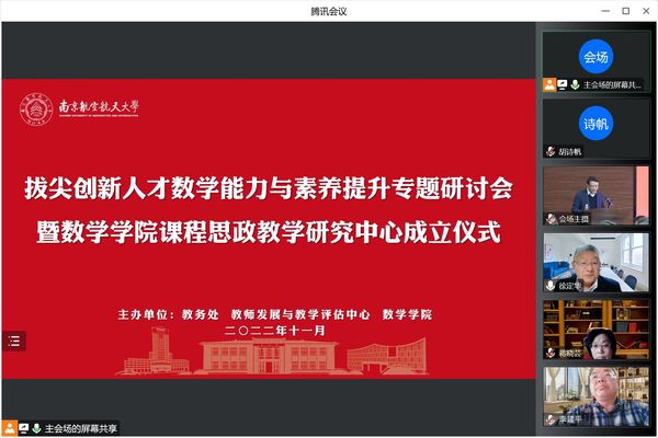 为深入学习贯彻党的二十大精神,贯彻落实科教兴国战略,强化现代化建设人才支撑,进一步推动理科卓越工程,提升新工科人才数学能力与素养,加快卓越理科人才建设,2022年11月20日,澳门网上博彩平台 联合教务处、教师发展与教学评估中心共同主办“拔尖创新人才数学能力与素养提升专题研讨会暨澳门网上博彩平台 课程思政教学研究中心成立仪式”。