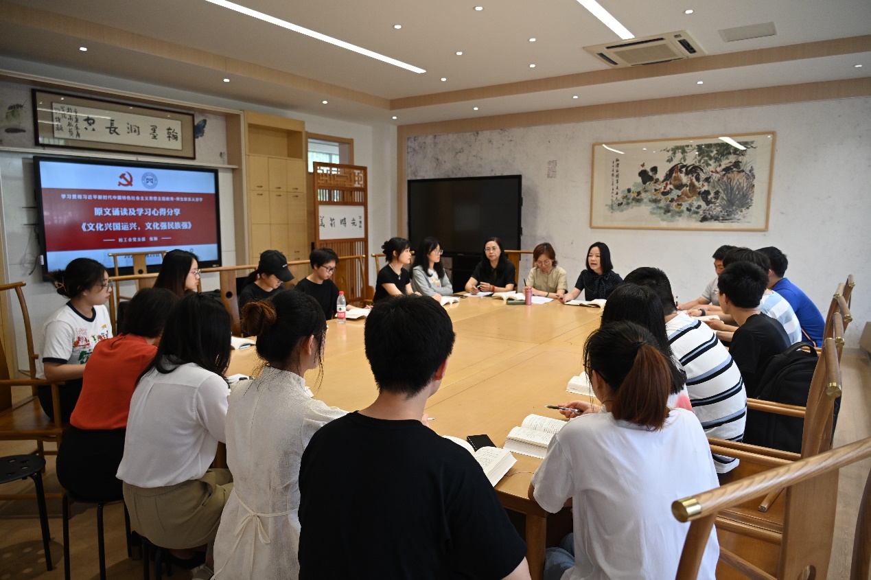 随后,两支部师生以“读原文,悟思想”形式共学《习近平新时代中国特色社会主义思想专题摘编》中关于“铸就社会主义文化新辉煌”的系列论述。校工会党支部张颖领读“文化兴国运兴,文化强民族强”章节,阐述了坚定中国人志气、骨气和底气的深刻意义。曾钰媛梦领读“建设具有强大凝聚力和引领力的社会主义意识形态”章节,表示将结合岗位继续努力提升宣传思想工作素养,更好担负起时代文化使命。