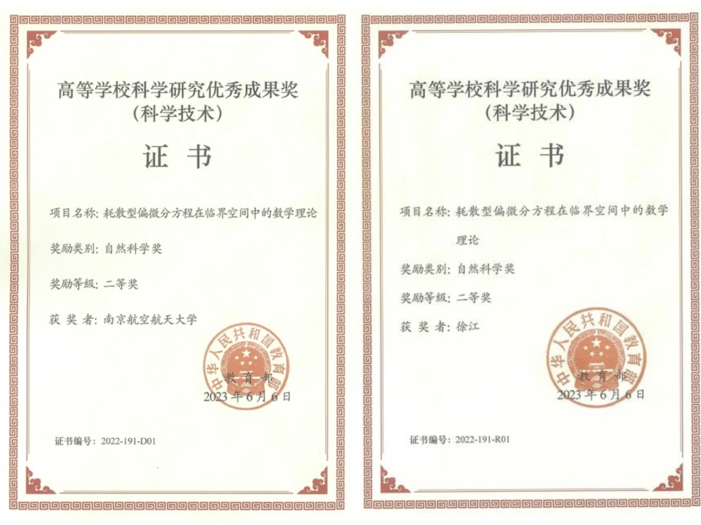 教育部于6月下旬发布了2022年度高等学校科学研究优秀成果奖(科学技术)的授奖通知。以南京航空航天大学为第一完成单位,澳门网上博彩平台 徐江教授为第一完成人的成果“耗散型偏微分方程在临界空间中的数学理论”荣获自然科学奖二等奖。该奖项由我校联合香港中文大学和暨南大学申报,澳门网上博彩平台 徐江教授,段仁军教授,刘双乾教授为主要完成人。