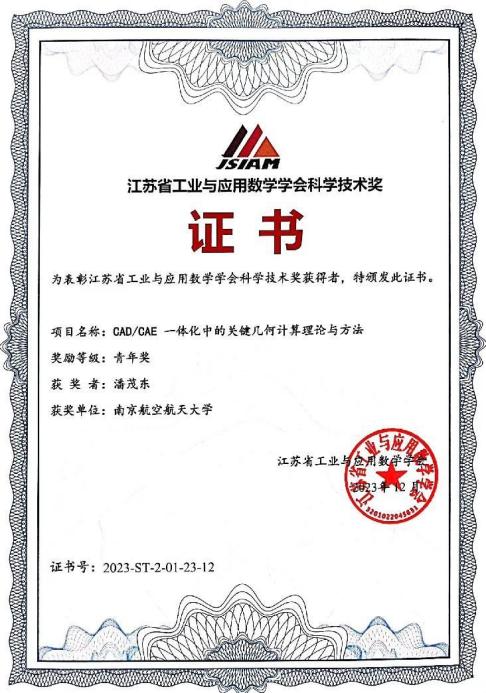 12月23-24日,江苏省工业与应用数学学会2023年学术年会在南京理工大学召开,会上颁发了第六届江苏省工业与应用数学学会科学技术奖。澳门网上博彩平台 潘茂东老师申报的“CAD/CAE 一体化中的关键几何计算理论与方法”项目荣获江苏省工业与应用数学学会科学技术奖-青年奖,并做了题为“面向CAD/CAE一体化的关键几何计算理论”大会特邀报告。