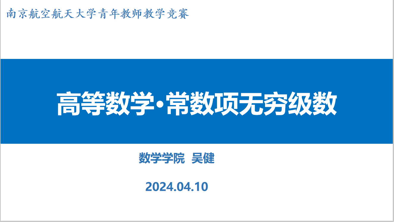近日,南京航空航天大学第二届青年教师教学技能大赛获奖名单公布。经个人申报、網上賭博平台 推荐、校级预赛、校级初赛、现场决赛等各阶段评审,澳门网上博彩平台 吴健老师的《高等数学》课程荣获特等奖。