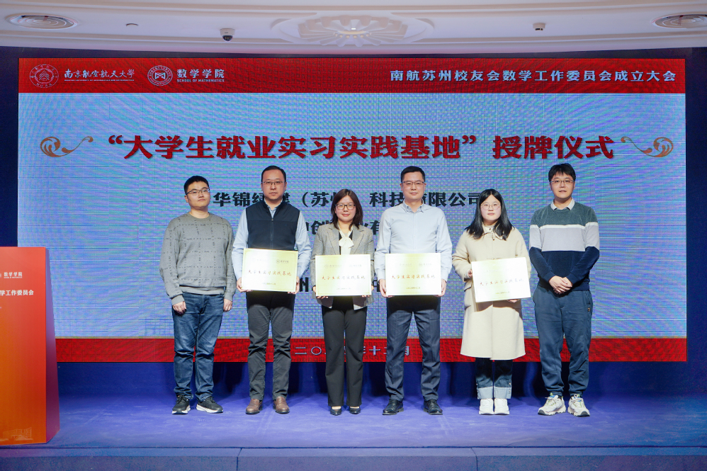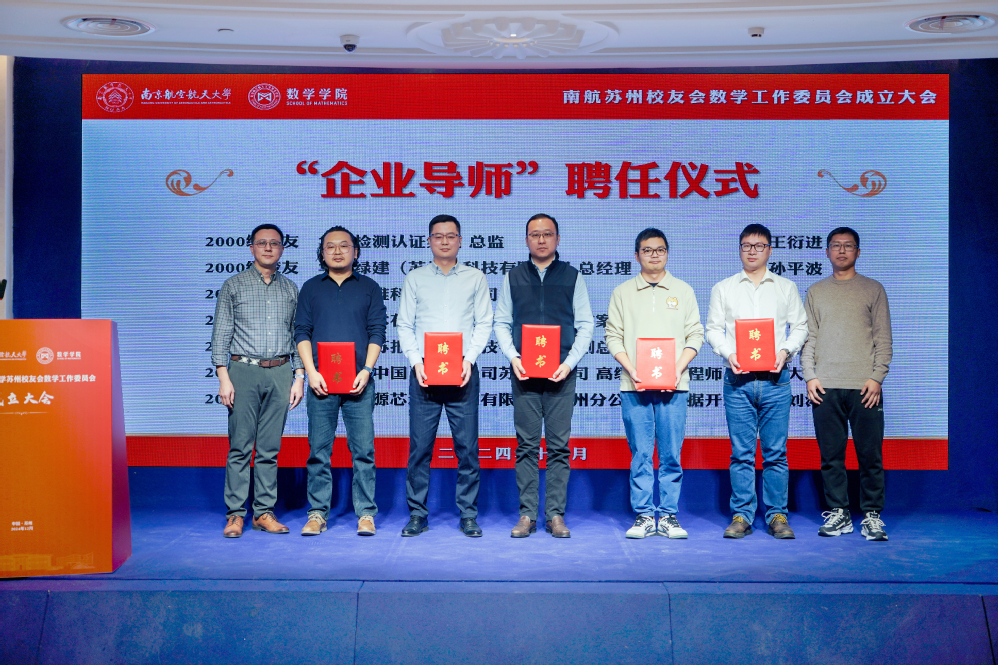 为更好凝聚育人合力,发挥校友力量,大会进行了澳门网上博彩平台 企业导师聘任仪式,并与在苏企事业单位共建了一批“大学生就业实习实践基地”。網上賭博平台 大学数学教学与研究中心主任朱晓星、数学系副主任潘星宏为2000级校友王衍进、孙平波、2001级校友杜斌、2003级校友林青春、2004级校友朱叶峰、2006级校友朱大龙颁发“企业导师”聘书。计算科学系副主任唐与聪、概率统计系副主任陈鹏,与周晓英、孙平波、杜斌、赵紫曼共同为实习实践基地揭牌。