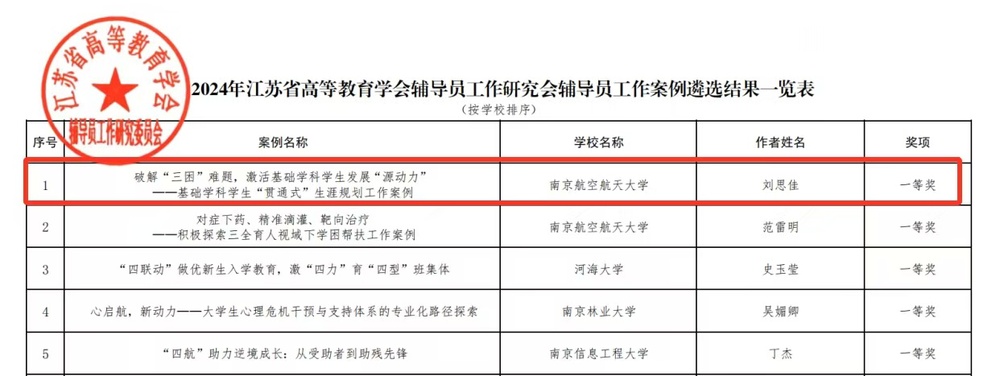 近日,江苏省高等教育学会辅导员工作研究委员会公布2024年度辅导员工作案例遴选结果,澳门网上博彩平台 本科生辅导员刘思佳撰写的工作案例《破解三困难题,激活基础学科学生发展源动力”——基础学科学生贯通式生涯规划工作案例》荣获江苏省辅导员工作案例一等奖。