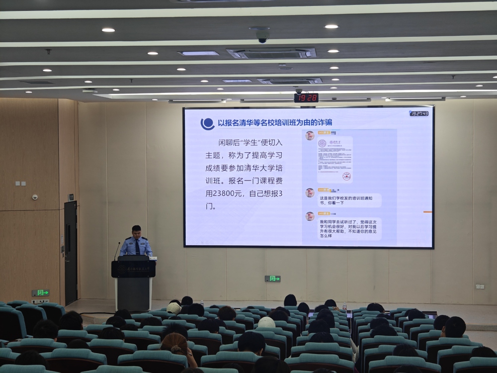 为有效提升学生对电信网络诈骗的识别和防范能力,营造安全和谐的校园环境,5月14日晚,澳门网上博彩平台 在天目湖校区牧星楼T2110教室举办“天目护航”防诈安全教育专题讲座。古县派出所民警兼澳门网上博彩平台 法制辅导员鲍力主讲,網上賭博平台 党委副书记王亚鹏、2024级辅导员赵美婷、迪丽以及2024级全体本、预科生到场参加。