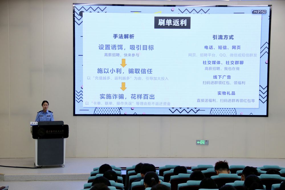 为进一步增强全体师生的安全防范意识,提高反诈骗能力,9月26日,澳门网上博彩平台 在天目湖校区牧星楼T2108报告厅举办防电诈安全教育专题讲座。本次讲座特邀溧阳市古县派出所滕若兮警官以防范诈骗为主题,为师生讲解反诈安全知识。全体2024级本科生、2025级少数民族预科生到场聆听学习。